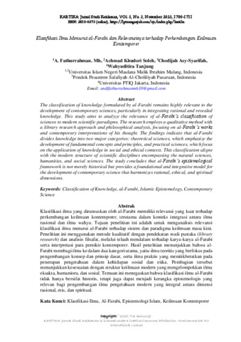 The classification of knowledge formulated by al-Farabi remains highly relevant to the development of contemporary sciences, particularly in integrating rational and revealed knowledge. This study aims to analyse the relevance of al-Farabi’s classification of sciences to modern scientific paradigms. The research employs a qualitative method, utilising a library research approach and philosophical analysis, with a focus on al-Farabi’s works and contemporary interpretations of his thought. The findings indicate that al-Farabi divides knowledge into two major categories: theoretical sciences, which emphasize the development of fundamental concepts and principles, and practical sciences, which focus on the application of knowledge in social and ethical contexts. This classification aligns with the modern structure of scientific disciplines encompassing the natural sciences, humanities, and social sciences. The study concludes that al-Farabi’s epistemological framework is not merely historical but provides a foundational and integrative model for the development of contemporary science that harmonizes rational, ethical, and spiritual dimensions.