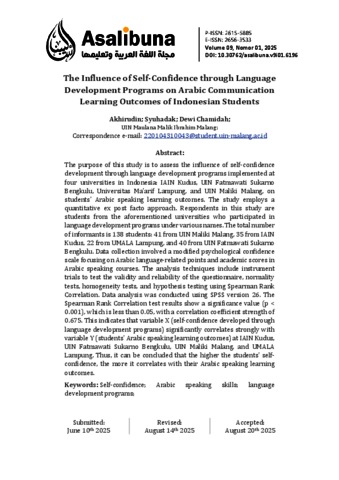 Asalibuna143-156+The+Influence+of+Self-Confidence+through+Language+Development+Programs+on+Arabic+Communication+Learning+Outcomes+of+Indonesian+Students.pdf Download (877kB) | Preview |