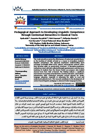 Syuhadak, Syuhadak, Rosyidah, Inayatur, Zamroni, Muh, Rusuly, Usfiyatur, Darasita, Yesi and Ibrahim, Faisal Mahmoud Adam (2025) Pedagogical approach to developing linguistic competence through contextual semantics in classical texts. Izdihar: Journal of Arabic Language Teaching, Linguistics, and Literature, 8 (2). pp. 275-290. ISSN 26227371