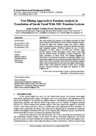 This study analyzes the emotions in the English translation of Surah Yusuf using the NRC Emotion Lexicon and text mining techniques. Focusing on eight basic emotions—anger, fear, sadness, disgust, surprise, anticipation, trust, and joy—the research identifies trust as the most dominant emotion (22.89%), followed by joy (15.66%), anticipation (13.25%), sadness (12.05%), fear (10.84%), anger (9.64%), surprise (8.43%), and disgust (7.23%). These results align with the narrative themes of prophecy, betrayal, forgiveness, and divine providence in Surah Yusuf. The findings highlight the effectiveness of lexicon-based methods in analyzing religious texts and provide insights into the emotional and spiritual dimensions of the Quran. This research contributes to the field of text mining in religious studies and has implications for education and religious interpretation. Future studies could expand the analysis to more verses, integrate machine learning techniques, and apply this approach to other religious texts.