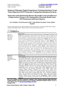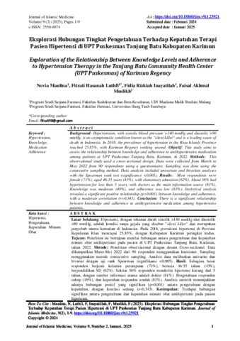 Maulina, Novia, Luthfi, Fitrati Hasanah, Inayatilah, Fidia Rizkiah and Muslikh, Faisal Akhmal (2025) Eksplorasi hubungan tingkat pengetahuan terhadap kepatuhan terapi pasien hipertensi di UPT Puskesmas Tanjung Batu Kabupaten Karimun. Journal of Islamic Medicine, 9 (2). pp. 1-9. ISSN 25500074
