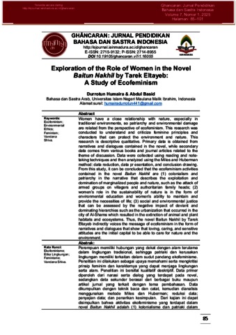 Women have a close relationship with nature, especially in traditional environments, so patriarchy and environmental damage are related from the perspective of ecofeminism. This research was conducted to understand and criticize feminine principles and characters that can protect the environment and nature. This research is descriptive qualitative. Primary data is obtained from narratives and dialogues contained in the novel, while secondary data comes from various books and journal articles related to the theme of discussion. Data were collected using reading and note-taking techniques and then analyzed using the Miles and Huberman method: data reduction, data pr esentation, and conclusion drawing. From this study, it can be concluded that the ecofeminism activities contained in the novel Baitun Nakhil are (1) colonialism and patriarchy in the narrative that describes the exploitation and domination of marginalized people and nature, such as the attack of armed groups on villagers and authoritarian family heads; (2) women's role in the sustainability of nature is in the form of environmental education and women's ability to maintain and provide the necessities of life; (3) social and environmental justice that can be assessed by the negative impact of deviant and dominating hierarchies such as the urbanization that occurred in the city of Al-Shams which resulted in the extinction of animal and plant habitats and ecosystems. Thus, the novel Baitun Nakhil by Tarek Eltayeb indirectly voices the message of ecofeminism in the form of narratives and dialogues that show that loving, caring, and sensitive attitudes are the initial capital to be able to care for nature and the environment.