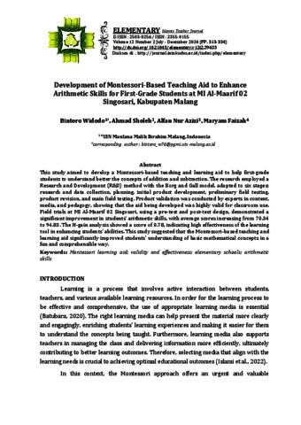 Development of Montessori-based addition teaching aid to enhance arithmetic skills of first-grade students at MI Al-Maarif 02 Singosari, Kabupaten Malang.