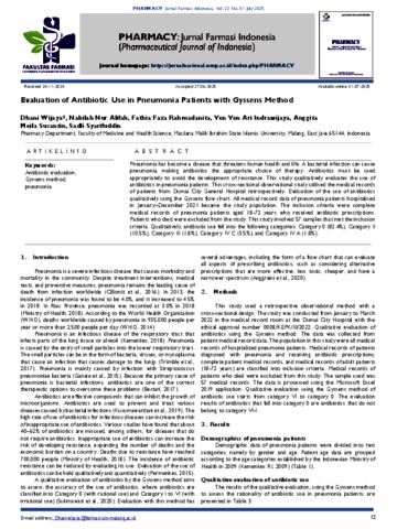 Pneumonia has become a disease that threatens human health and life. A bacterial infection can cause pneumonia, making antibiotics the appropriatechoice of therapy. Antibiotics must be used appropriately to avoid the development of resistance. This study qualitatively evaluates the use of antibiotics in pneumonia patients. This cross-sectional observational study utilised the medical records of patients from Dumai City General Hospital retrospectively. Evaluation of the use of antibiotics qualitatively using the Gyssens flow chart. All medical record data of pneumonia patients hospitalisedin January–December 2021 became the study population. The inclusion criteria were complete medical records of pneumonia patients aged 18-72 years who receivedantibiotic prescriptions. Patients who died were excluded from the study. This study involved 57 samples that met the inclusion criteria. Qualitatively, antibiotic use fell into the following categories: Category 0 (82.4%), Category II (10.5%), Category III (1.8%), CategoryIV C (3.5%), and Category IV A (1.8%).