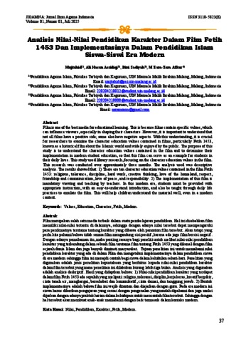 Film is one of the best media for educational learning. This is because films contain specific values, which can influence viewers, especially in shaping their characters. However, it is important to understand that not all films have a positive side; some also have negative aspects. With this understanding, it is crucial for researchers to examine the character education values contained in films, particularly Fetih 1453, known as a historical film about the Islamic world and widely enjoyed by the public. The purpose of this study is to understand the character education values contained in the film and to determine their implementation in modern student education, so that this film can serve as an example for students in their daily lives. This study used library research, focusing on the character education values in the film. This research was conducted over approximately three months. The analysis used was descriptive analysis. The results showed that: 1) There are ten character education values contained in the film Fetih 1453: religious, tolerance, discipline, hard work, creative thinking, love of the homeland, respect, friendship and communication, love of peace, and responsibility. 2) The implementation of this film is mandatory viewing and teaching by teachers. In this modern era, students must be provided with appropriate instruction, with an easy-to-understand introduction, and also be taught through daily life practices to emulate the film. This will help children understand the material well, even in a modern context.