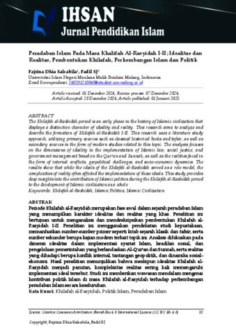 Salsabila, Fajrina Dhia and Fadil, Fadil (2025) Peradaban Islam pada masa Khalifah Al-Rasyidah I-II; Idealitas dan realitas, pembentukan khilafah, perkembangan Islam dan politik. Ihsan: Jurnal Pendidikan Islam, 3 (1). pp. 32-42. ISSN 29871298