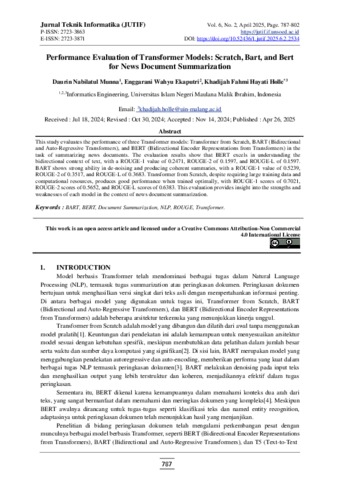 Performance evaluation of Transformer models: Scratch, Bart, and Bert for news document summarization.