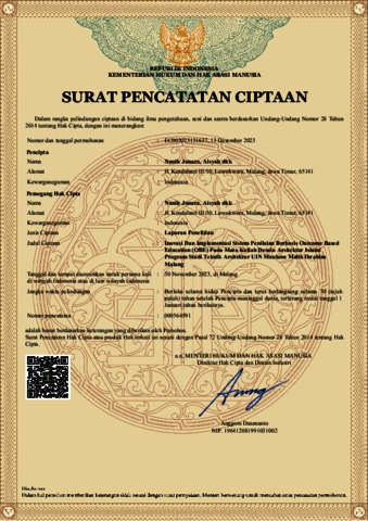 HAKI (2023) Inovasi dan Implementasi Sistem Penilaian Berbasis Outcome Based Education (OBE) pada Mata Kuliah Desain Arsitektur Islami Program Studi Teknik Arsitektur UIN Maulana Malik Ibrahim Malang (sertifikat hak cipta). EC002023131637.