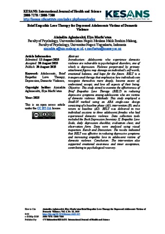 Introduction: Adolescents who experience domestic violence are vulnerable to psychological disorders, one of which is depression. Violence perpetrated by primary attachment figures may damage an individual's self-worth, emotional balance, and hope for the future. BELT is a transpersonal therapy that emphasizes how individuals can recognize themselves more deeply, become aware of, understand, accept, and love all aspects of their being. Objective: This study aimed to examine the effectiveness of Brief Empathic Love Therapy (BELT) in reducing depressive symptoms among adolescents who are victims of domestic violence. Methods: This study employed a Small-N method using an ABA single-case design consisting of a baseline phase (A1), intervention (B), and a return to baseline (A2). BELT was delivered in two individual sessions to three adolescent females who had experienced domestic violence. Data collection tools included the Beck Depression Inventory II, Empathic Love Scale, daily depression checklist, evaluation sheet, and observation form. Data were analyzed using visual inspection. Result and Discussion: The results indicated that BELT was effective in reducing depressive symptoms and increasing empathic love in adolescent victims of domestic violence. Conclusion: The intervention also supported emotional awareness and inner acceptance, contributing to psychological recovery.