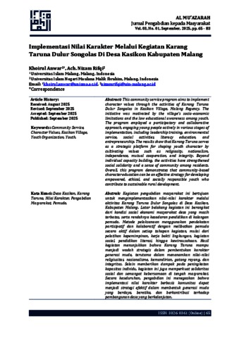 Kegiatan pengabdian masyarakat ini bertujuan untuk mengimplementasikan nilai-nilai karakter melalui aktivitas Karang Taruna Dulur Songolas di Desa Kasikon, Kabupaten Malang. Latar belakang kegiatan ini berangkat dari kondisi sosial ekonomi masyarakat desa yang masih terbatas, serta rendahnya kesadaran pendidikan di kalangan pemuda. Metode pelaksanaan menggunakan pendekatan partisipatif dan kolaboratif dengan melibatkan pemuda secara aktif dalam setiap tahapan kegiatan, mulai dari pelatihan kepemimpinan, kerja bakti lingkungan, kegiatan sosial, pendidikan literasi, hingga kewirausahaan. Hasil kegiatan menunjukkan bahwa Karang Taruna mampu menjadi wadah strategis dalam pembentukan karakter generasi muda, terutama dalam menanamkan nilai-nilai religiusitas, nasionalisme, kemandirian, gotong royong, dan integritas. Selain memberikan dampak pada peningkatan kapasitas individu, kegiatan ini juga memperkuat solidaritas sosial dan semangat kebersamaan di tengah masyarakat. Secara keseluruhan, pengabdian ini menegaskan bahwa implementasi nilai karakter berbasis komunitas dapat menjadi strategi efektif dalam membentuk generasi muda yang berdaya, beretika, dan berkontribusi terhadap pembangunan desa yang berkelanjutan