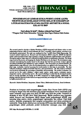Sa'adah, Umi Lailatus and Utami, Mutiara Arlisyah Putri (2025) Pengembangan Lembar Kerja Peserta Didik (LKPD) terintegrasi keislaman untuk melatih kemampuan literasi matematika pada materi aritmetika sosial kelas VII SMP. FIBONACCI: Jurnal Pendidikan Matematika dan Matematika, 11 (1). pp. 65-80. ISSN 2460-7797