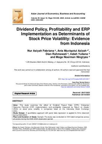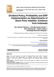 Keywords: Enterprise resource planning, dividend payout ratio, profitability, return on assets, stock price volatility, Indonesia stock exchange