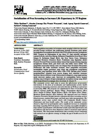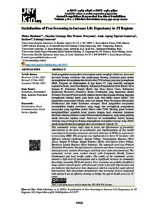 Studi pengabdian masyarakat ini bertujuan untuk mengkaji efektivitas intervensi preventif berupa sosialisasi dan pelaksanaan skrining kesehatan gratis dalam meningkatkan kewaspadaan dan deteksi dini PTM sebagai prasyarat peningkatan HKH. Program ini dilaksanakan di tiga lokasi 3T yang memiliki tantangan regional berbeda, yaitu Desa Bojong, Kabupaten Pangandaran (Jawa Barat); Desa Songan B, Kabupaten Bangli (Bali); dan Desa Sipora Utara, Kabupaten Kepulauan Mentawai (Sumatera Barat). Pendekatan yang digunakan adalah Promotif-Preventif Primer melalui edukasi intensif dan layanan skrining langsung (pengukuran tekanan darah, gula darah acak, dan indeks massa tubuh). Tim pengabdian masyarakat bekerja sama erat dengan Pusat Kesehatan Masyarakat (Puskesmas) dan kader kesehatan setempat. Hasil pengabdian masyarakat menunjukkan tingkat partisipasi yang tinggi dan peningkatan pengetahuan masyarakat yang signifikan terkait faktor risiko PTM. Skrining gratis berhasil mengidentifikasi sejumlah besar peserta dengan hasil abnormal (terutama hipertensi dan pra-diabetes) tetapi belum pernah terdiagnosis, yang sangat penting untuk intervensi rujukan cepat. Intervensi ini menunjukkan bahwa layanan skrining yang terintegrasi dengan penjangkauan merupakan strategi yang efektif untuk menjembatani kesenjangan akses kesehatan di wilayah 3T.