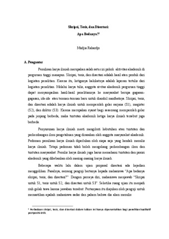 Penulisan karya ilmiah merupakan salah satu ciri pokok aktivitas akademik di perguruan tinggi manapun. Skripsi, tesis, dan disertasi adalah hasil atau produk dari kegiatan penelitian. Karena itu, ketiganya hakikatnya adalah laporan tertulis dari kegiatan penelitian. Melalui karya tulis, anggota sivitas akademik perguruan tinggi dapat menyampaikan hasil-hasil penelitiannya ke masyarakat berupa gagasangagasan, ide-ide atau temuan-temuan baru untuk diambil manfaatnya. Skripsi, tesis, dan disertasi adalah karya ilmiah untuk memperoleh gelar sarjana (S1), magister (S2), dan doktor (S3). Karena merupakan syarat bagi seseorang memperoleh gelar pada jenjang berbeda, maka tuntutan akademik ketiga karya ilmiah tersebut juga berbeda.