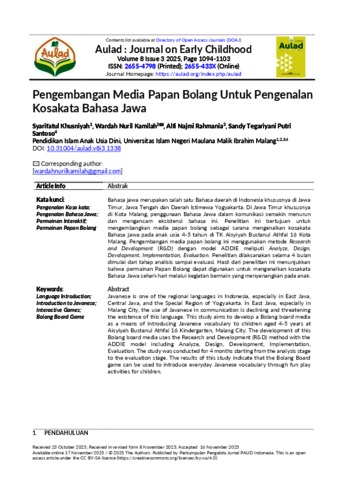 Bahasa jawa merupakan salah satu Bahasa daerah di Indonesia khususnya di Jawa Timur, Jawa Tengah dan Daerah Istimewa Yogyakarta. Di Jawa Timur khususnya di Kota Malang, penggunaan Bahasa Jawa dalam komunikasi semakin menurun dan mengancam eksistensi bahasa ini. Penelitian ini bertujuan untuk mengembangkan media papan bolang sebagai sarana mengenalkan kosakata Bahasa jawa pada anak usia 4-5 tahun di TK Aisyiyah Bustanul Athfal 16 Kota Malang. Pengembangan media papan bolang ini menggunakan metode Research and Development (R&D) dengan model ADDIE meliputi Analyze, Design, Development, Implementation, Evaluation. Penelitian dilaksanakan selama 4 bulan dimulai dari tahap analisis sampai evaluasi. Hasil dari penelitian ini menunjukkan bahwa permainan Papan Bolang dapat digunakan untuk mengenalkan kosakata Bahasa Jawa sehari-hari melalui kegiatan bermain yang menyenangkan pada anak.