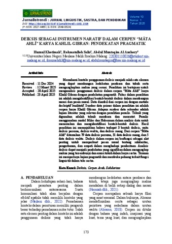 Khotimah, Husnul, Salis, Rohmatulloh and Anshory, Abdul Muntaqim Al (2025) Deiksis sebagai instrumen naratif dalam cerpen “Māta Ahlī” karya Kahlil Gibran: Pendekatan pragmatik. Jurnalistrendi : Jurnal Linguistik, Sastra dan Pendidikan, 10 (1). pp. 173-181. ISSN 25490524