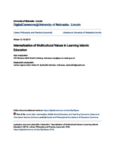 Supriyatno, Triyo and Ubabuddin, Ubabuddin (2019) Internalization of multicultural values in learning Islamic education. Library Philosophy and Practice. ISSN 1522-0222