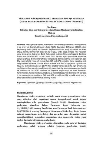 The objectives of this research to analize the influence risk management is as proxy of Capital Adequacy Ratio (CAR), Operation Efficiency (BOPO), Non Performing Loan (NPL), to Financial Performance is as proxy of Return on Asset (ROA) Banking Firms wich listed on BEI in 2011 until 2016 periods. This research using time series data from Bank Indonesia’s published financial reports Banking Firms wich listed on BEI in 2002 until 2007 periods. After passed the purposive sampling phase, the number of valid sample is 5 Banking Firms wich listed on BEJ. The result of this research shows that CAR and NPL variables has a negative and unsignificant influence to ROA. BOPO variable also has a significant influence to ROA, the distinction between BOPO than another variables is the sign of variable coefficient, it has negative coefficient. It’s mean that the bank managements should be concern on the BOPO variable to improve profitability on their Financial Performance. Disintermediary functions of bank that occurs in the research periods is the reason for unsignificant CAR and NPL variable to ROA variable wich is as a proxy of Financial Performance Banking Firms.
